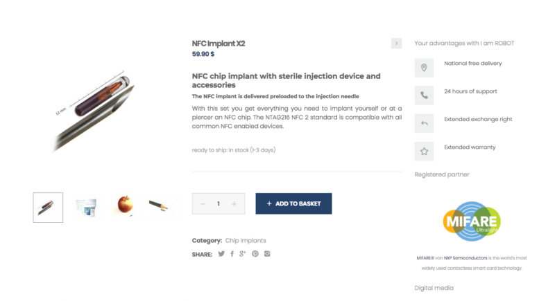I am Robotのウェブサイトでは60〜80ユーロほどでマイクロチップを購入でき、購入後は専門の施設、または同社が提供する注射器で、埋め込むことになります。同社のマイクロチップと連動するドアノブなどを導入すれば、マイクロチップを鍵として利用できるようになるといいます。
