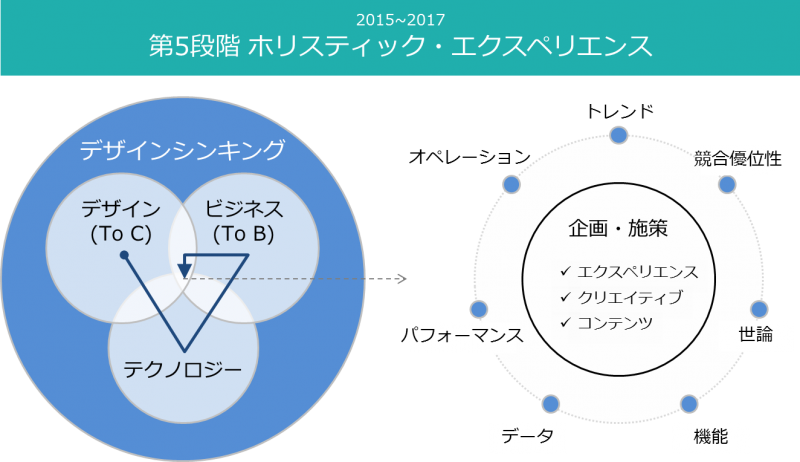 toBとtoCそれぞれのエクスペリエンスを合わせて考えることによって、BtoBtoC型プラットフォームとしてのUXが出来上がります。2012年から15年くらいの方法論です。」